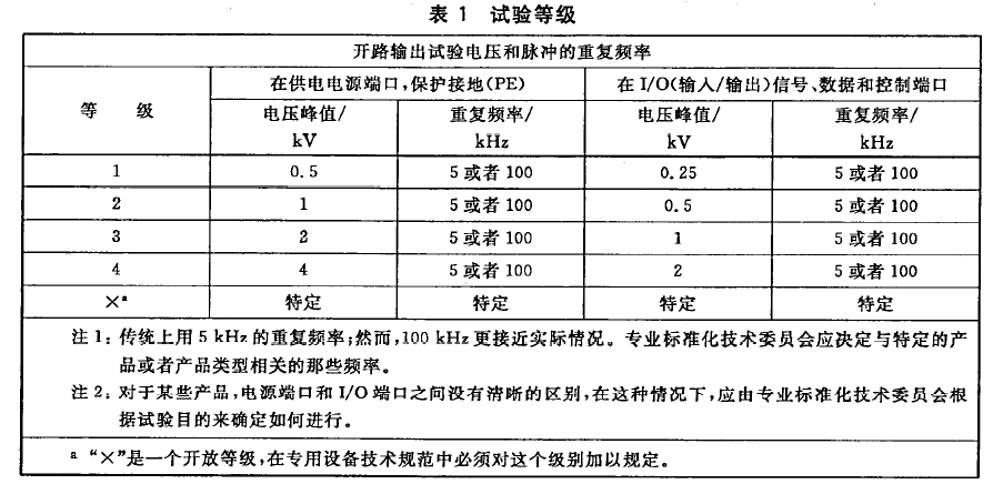 以下表格(表1)列出了EFT试验等级及分别针对供电电源端口、保护接地以及I/O信号、数据和控制端口对应的电压峰值和重复频率。