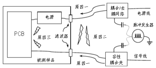 如图二所示,EFT干扰主要通过以下几种途径干扰被测设备: