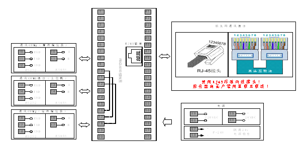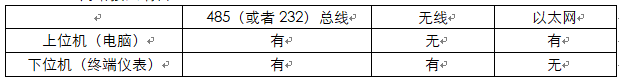 它与终端仪表的物理连接方式有两种:可以采用485总线方式(或者符合RS232规范)的线缆连接方式,也可采用占用固定频道的无线数据传输方式;与上位机的连接方式也有两种:可以是RS485(或者RS232)总线,也可以用网络线接入以太网(Ethernet)。