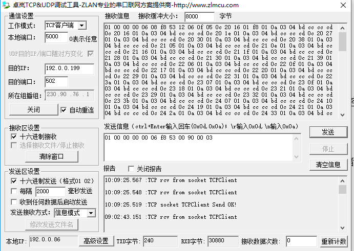 以太网是开放共享的,当然不仅是BT7000软件,其它类型的客户端软件都可以连接FBCS6000现场通讯服务器,使用其数据服务功能。图7是用其它软件对IP地址为192.0.0.199的FBCS6000连接并读取记录的数据,此命令是批读(一次可以读取0.5~1.5K的数据)命令。用此命令读取数据并在上位机电脑建立数据库,可以查询任意时间点的现场数据,做报表,分析工控系统运行状态。