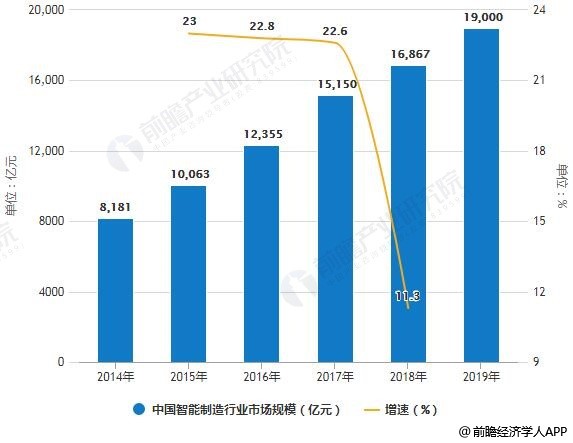 据前瞻产业研究院发布的《智能制造行业市场前瞻与投资战略规划分析报告》统计数据显示,2014年中国智能制造行业市场规模已达8181亿元。2015年中国智能制造行业市场规模突破万亿元。截止到到2017年中国智能制造行业市场规模增长至15150亿元,同比增长22.6%。初步测算2018年中国智能制造行业市场规模达到16867亿元左右。并预测在2019年中国智能制造行业市场规模将超1.9万亿元。