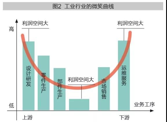 传统制造业以设备的生产制造为主,目前正逐步向综合服务方向转型。从价值创造的角度,传统制造业向综合服务转型具有很多优势。一是综合服务商的收益更高,一般来讲,根据工业行业的微笑曲线(如图2),服务拥有较大的利润空间。对比单纯的销售设备,服务的利润高于产品本身并且收入稳定。二是客户需求发生变化,顾客对产品的购买决策除了性能参数和价格,还取决于服务质量。三是综合服务有助于企业的可持续发展,通过设备销售之后的综合服务,提高了客户对产品的粘性,促进订单再销售,实现企业可持续发展。四是综合服务商更能满足客户的综合需求,特别是定制化和个性化的需求,由于企业和客户之间良好的互动,使得企业与客户之间的关系由原来的交易型转变为了关系型。