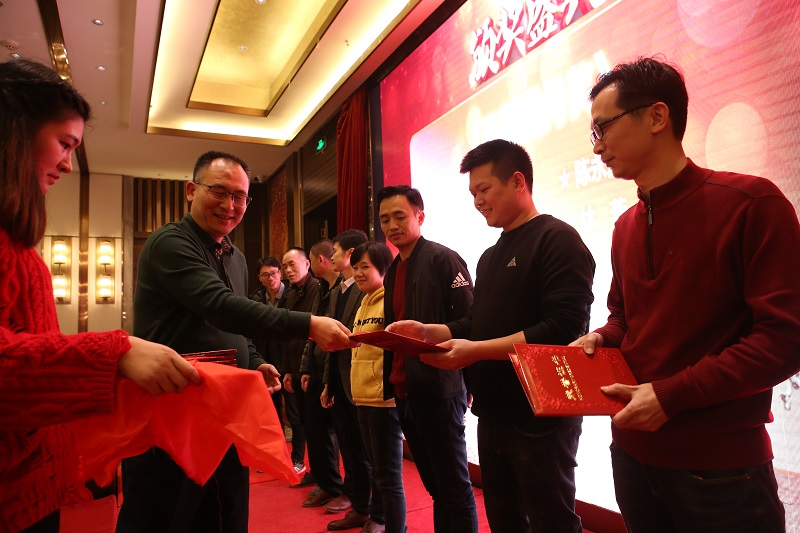 年会伊始,率先进行了“风雨同舟奖”颁奖。在温情的音乐声中,公司总经理林荣强一一向台上8位过去为公司默默奉献十年光阴的员工们颁发奖状及5000元现金红包,并亲切地握手对他们多年坚守岗位所付出的努力与贡献致以最衷心地感谢。