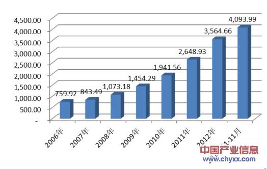 在医药工业发展和强制GMP认证的大背景下,我国主要的制药企业近年来纷纷加大了固定资产的投资规模。根据统计局的数据显示,2006年至2012年间,我国医药制造业固定资产投资额保持快速增长,2012年医药制造业全年累计固定资产投资额达3,564.66亿元,过去5年复合增长率达29.38%。2013年1-11月,医药制造业累计固定资产投资额已达4,093.99亿元,超过2012年全年水平。