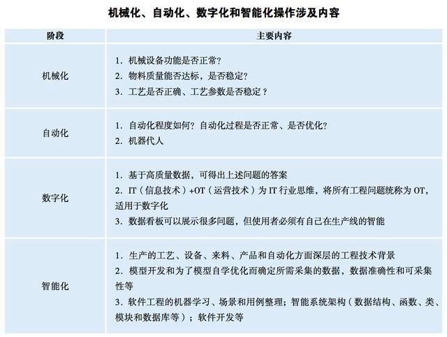 当生产过程不够优化时,首先在无自动化的情况下进行诊断分析;这可以认为是在机械化层面。直到相关的问题都解决了,才对自动化问题进行审核。所有这一切都可以通过数字化加以快速诊断和总体确认,即当现场采集到高质量数据时,可以通过数据鉴别出哪个环节是弱点。现在市面上有一种“IT+OT技术”(信息技术+运营技术),在数字化阶段将所有工程问题简化成OT(尽管这对智能制造有些过于简化)。通过数据看板,确实可以看出很多问题,但是数据看板的使用者必须对生产过程有足够的的理解。如果生产线只有数字制造,而没有智能制造,必须要有工程师对现场的指导,因为操作工人很难从数据上看出很多问题,更难根据复杂的数据找出解决方案。