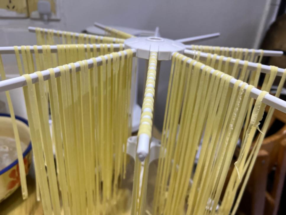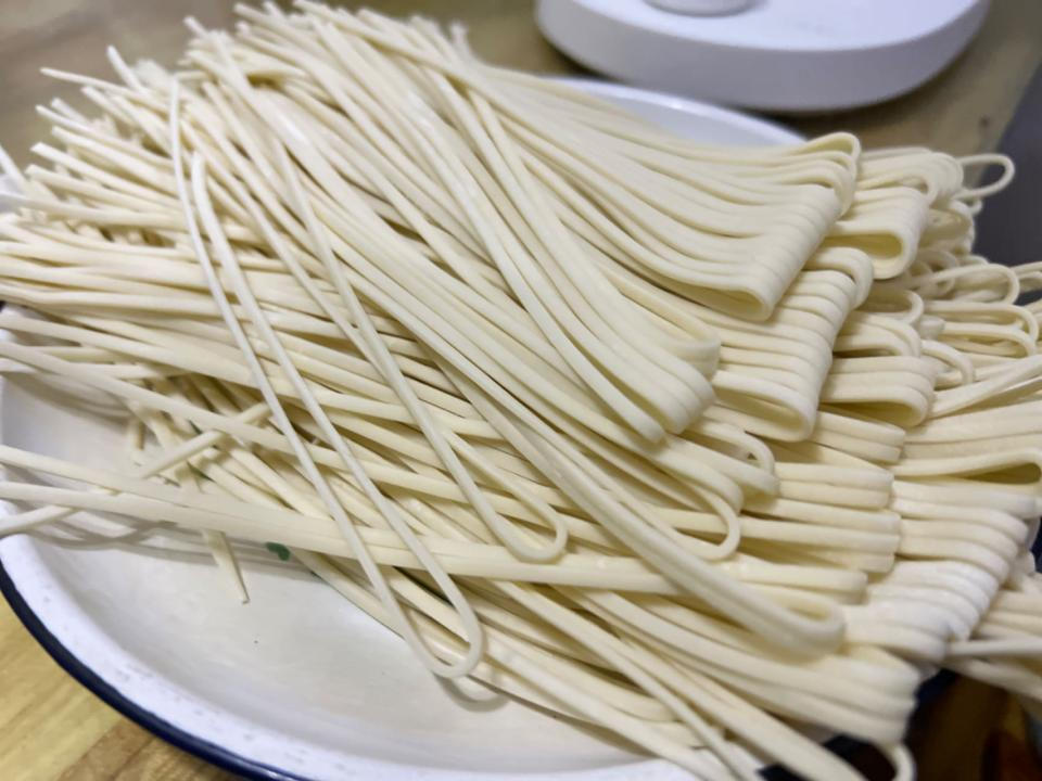 经过娃他爸的研究,我们终于依照面条机的特性将面团的水和面粉的配比、软硬程度,有了明确的认知。太软太湿的面团,容易黏粘,不易干;而太硬的面团对于简易的面条机又无法压到最薄。就这样经过不断地实验研究,终于做出了符合宝宝食用的超薄全蛋面条,看到一根根整齐排列的面条,我直感叹美食背后的付出。我常常打趣娃他爸:“以后若是失业就支摊卖面食去。”娃他爸则反击我说:“咱们若是真要支摊售卖,指不定得赔本;一、用料足,成本高;二、产量太少。”此言一出,顿时把我副业卖面条的念想给打消了。