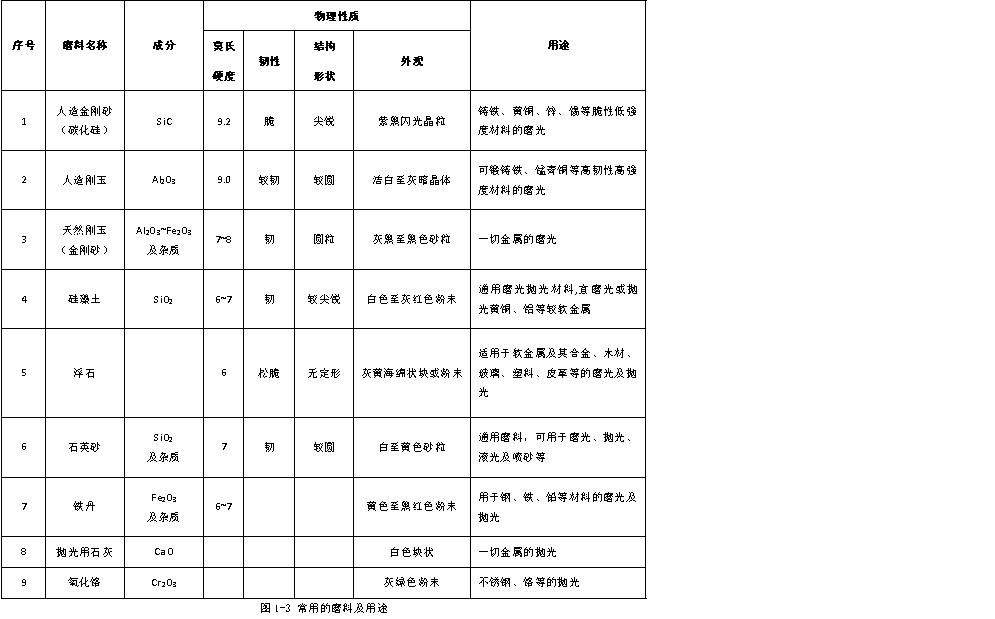 磨光是指使用沾有磨料的磨光轮或磨光带在高速旋转下切削金属工件表面的毛刺、锈迹、氧化皮等缺陷,提高表面的平整度,根据零件的硬度选择合适的磨料。常用的磨料及用途如图1-3所示: