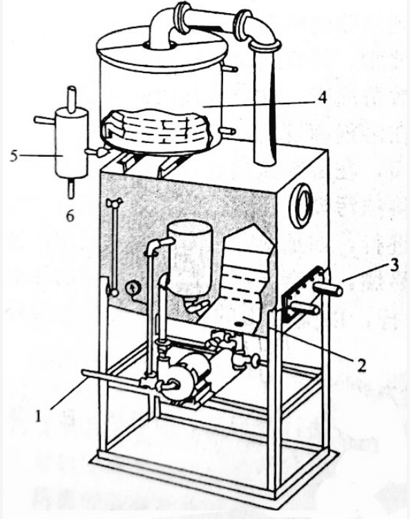装置及其主要构造:1.沾污溶剂进料管;2.沸腾溶剂蒸馏室;3.落汽蛇管接头;