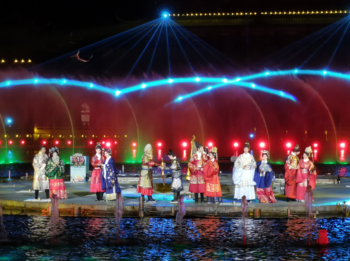 9点半,城门如约而至地开启了。从城门中出来的身着铠甲的武士和手拿灯笼的美女演员们,为我们上演了一场闽王迎宾的表演。然而由于全国各地纷沓而来围观的同袍身高都好高,我这种五短身材只能在夹缝中窥探真章,那时便想着我要是再高点该多好啊。迎宾表演后,便是按照前几届的惯例,依序按照社团次序,庄严入城。从城门走过之后便跟着前方的队伍走到广场对面的座椅上一起来了张大合照,合照结束的我们便跟着大队伍来到了福船广场。