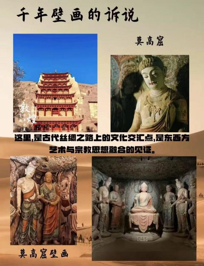 佛光穿过丝绸之路上的风沙,凝结了人类的虔诚和智慧。风沙侵蚀的悬崖之下,每一颗沙粒,都承载着一份文明的厚重。行走在洞穴中,岁月从笔尖流淌而过。北朝的飞衣姿态优美,衣袂飘飘,盛唐的佛像,低垂着眼帘,微笑着,挂着如银河般的项链。五代的供养人服饰华美,眉间隐有丝绸之路行商的传说。朱砂、石青、金箔在斑驳之中,依然灿烂。佛祖拈花一笑,飞天弹起琵琶,《经变图》中,莲池涟漪。敦煌,不只是一面石墙,更像是一部以颜色绘就的宏大史诗。